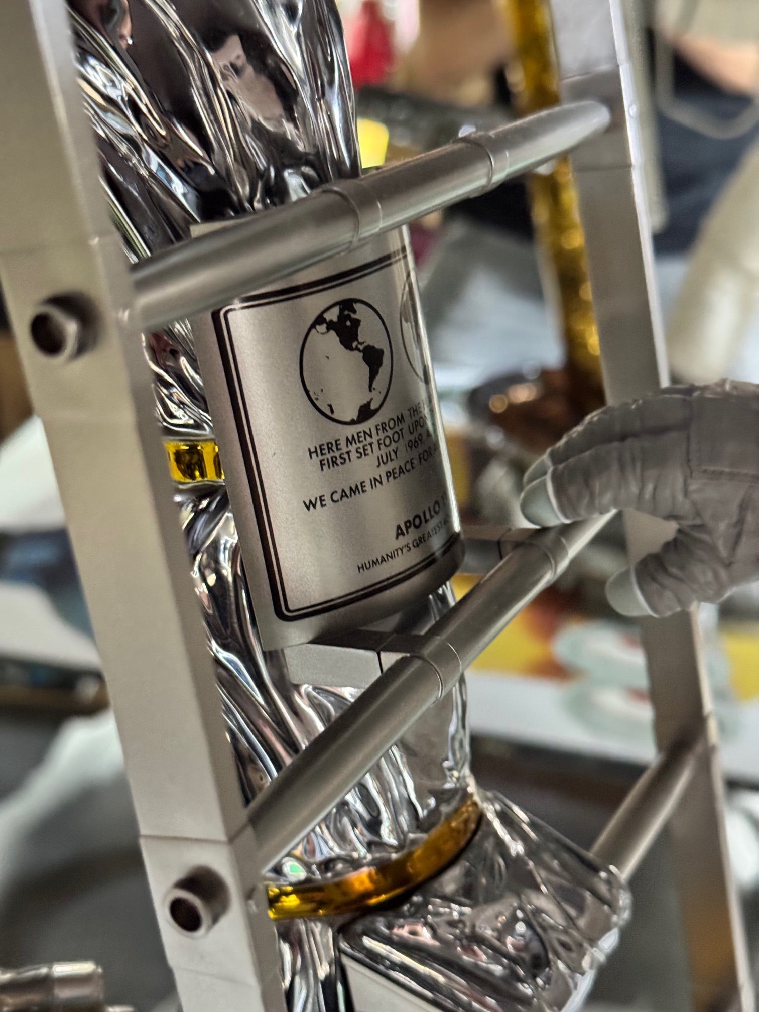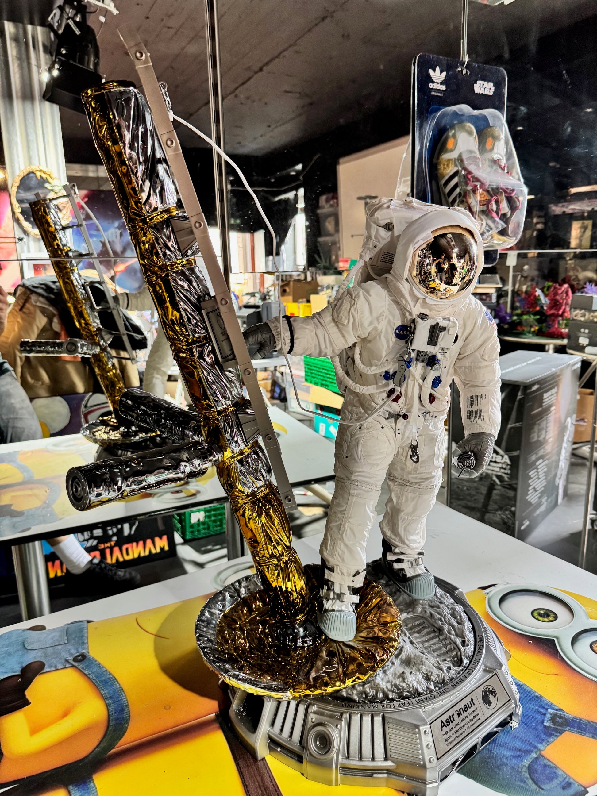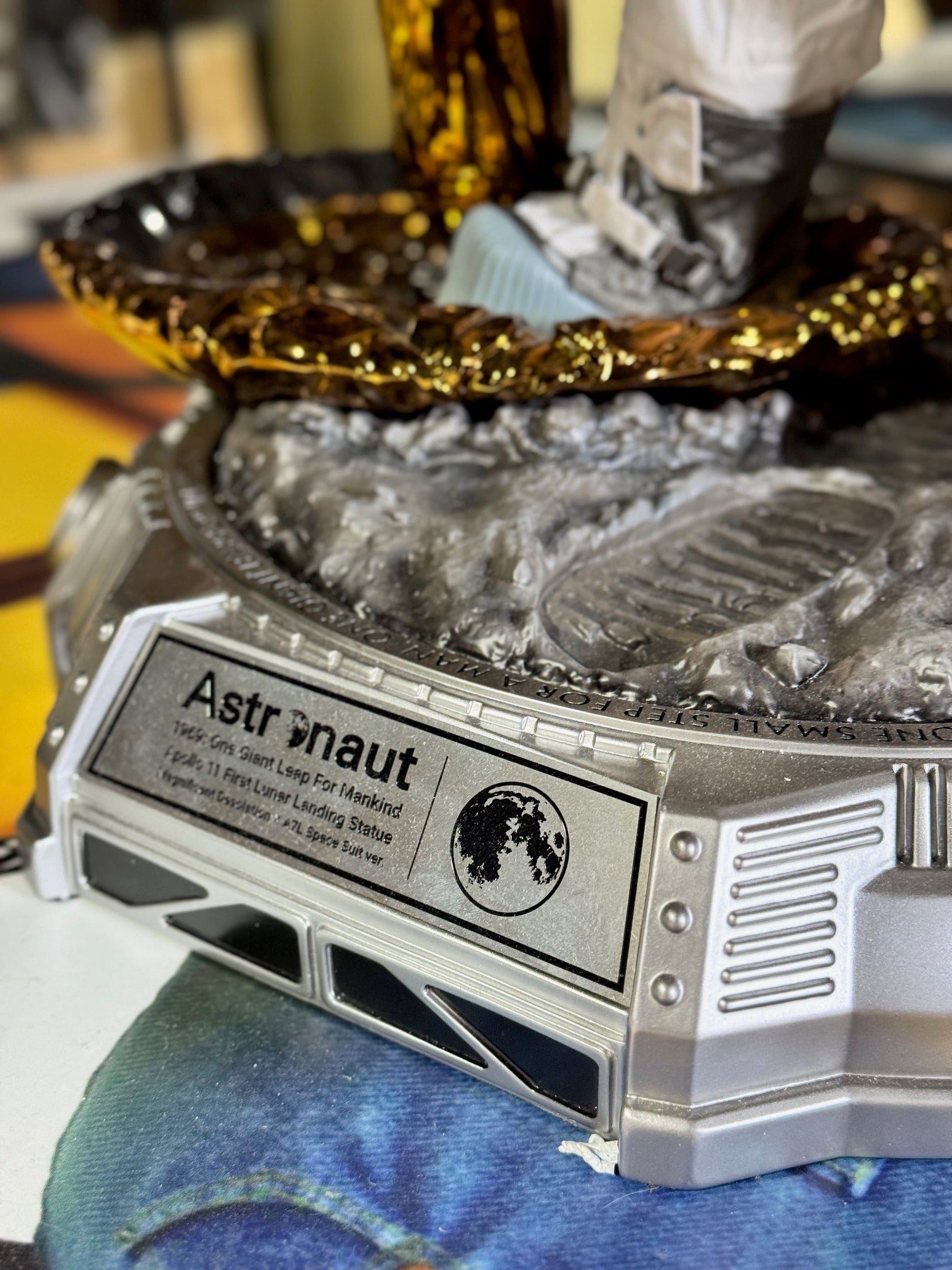 Maßstab 1/4. Blitzway. Den historischen Augenblick vom 21. Juli 1969 würdigt Blitzway jetzt mit einer fantastischen Figur: der Apollo 11 Astronaut betritt die Mondoberfläche. Realistischer A7L Raumanzug aus Stoff; LM 5 Landebein mit Leiter; Sicherheitsgurt Astronaut-LM; Sample Container. Basis mit einem Stück der Mondoberfläche. Material: Resin; Metall; Stoff; PVC.
